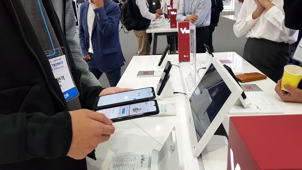V50S씽큐 체험존에서는 듀얼 스크린 멀티태스킹 성능을 확인하면서 설명을 듣는 모습이 띄였다. 인공지능 전시존인 ‘LG씽큐 홈’에서는 거실, 주방, 홈오피스, 홈시네마, 스타일링룸 등을 각 공간에 배치했다. 여기서는 LG 시그니처 에어컨, 공기청정기, 냉장고, 세탁기 등을 선보였다.