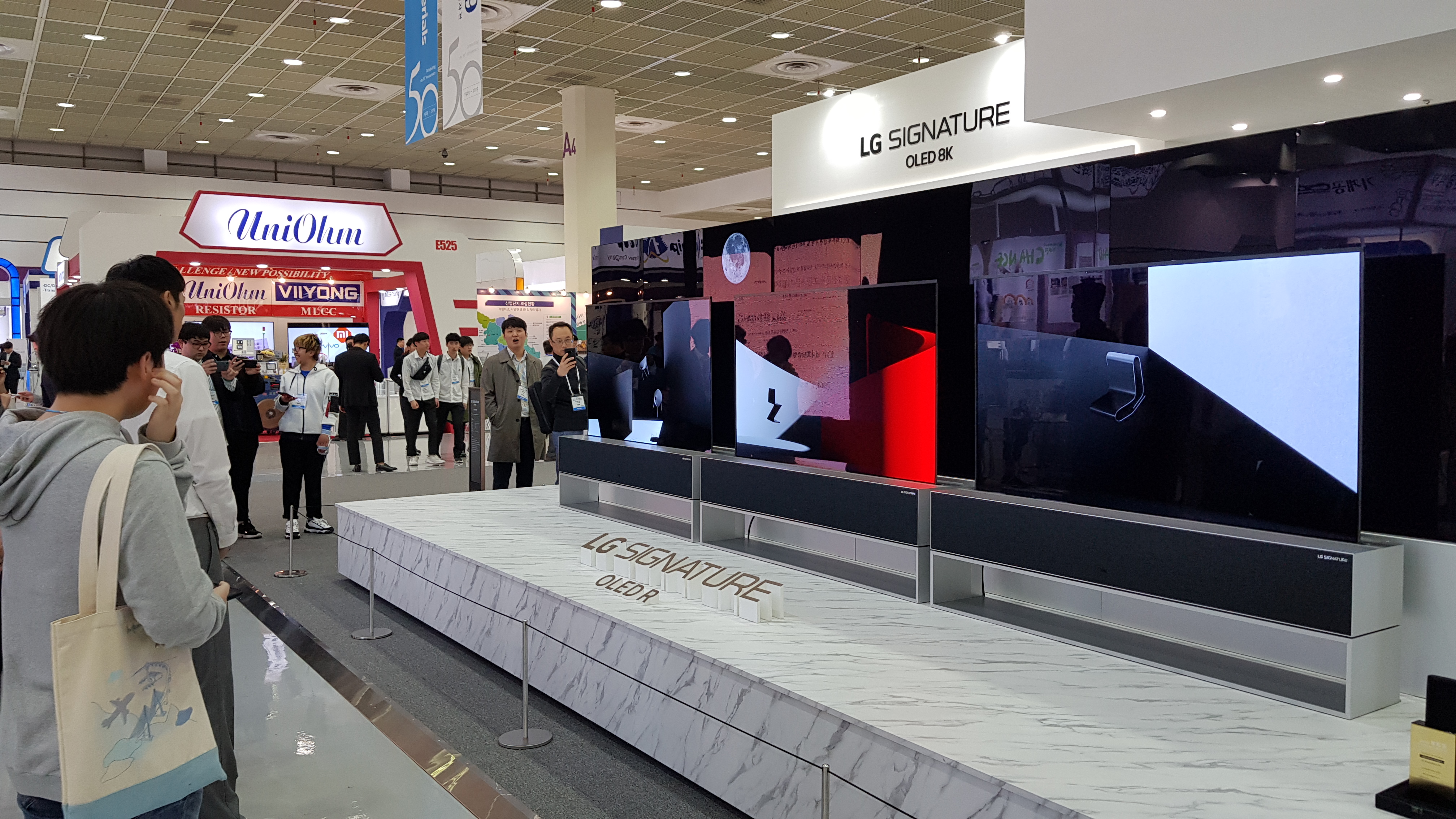 올해 한국전자전에서 눈길을 끈 LG제품은 롤러블 TV였다. 부스 입구에 마련된 3대의 롤러블 TV는 화면 그 자체를 본체 안으로 돌돌 말아 집어넣었다가 천천히 다시 펼졌다. 화면이 유연하게 말리면서도 아무런 흔적도 남지 않았고 화질 역시 매우 선명했다. 이렇게 '접는' TV는 국내 업체의 기술력에서 구현 가능한 것으로 앞으로 TV분야에서도 큰 경쟁력을 가져다 줄 것으로 보인다.