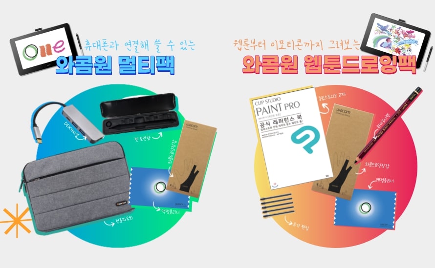 이번 와콤원 스페셜 패키지는 디지털 노마드나 카공족을 겨냥해 휴대와 호환성을 높인 ‘와콤원 멀티팩’, 드로잉 교재와 호환 펜을 추가해 웹툰 및 이모티콘 등 디지털 창작을 위한 ‘와콤원 웹툰 드로잉팩’ 총 2가지 버전으로 출시됐다. 패키지별 작업 목적에 최적화된 액세서리가 함께 구성돼 있어 약 10만원 상당의 사은품 혜택을 받을 수 있다.