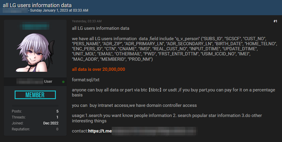 이번 개인정보 유출건은 새해 초인 1월 1일부터 터져나왔다. 해킹포럼에 LG의 사용자 정보 데이터를 판매한다는 게시글이 올라왔는데 판매자는 데이터 규모를 2000만건 이상이라고 말했다. 샘플 데이터도 공개했는데, 여기에는 생년월일과 전화번호, 이메일주소, 휴대폰 모델명도 포함됐기에 LG유플러스의 데이터로 추정됐다.